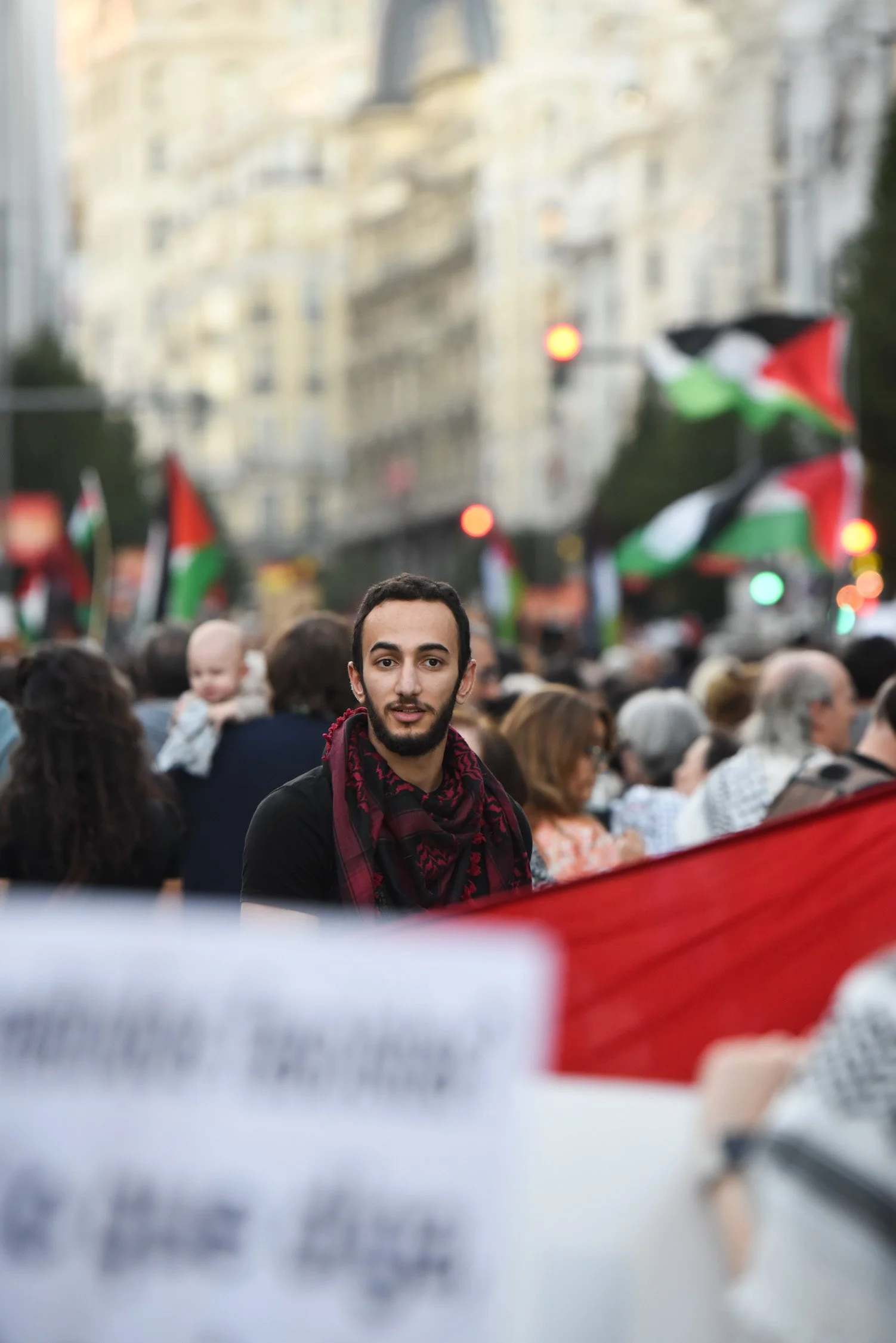 4/11/2025. En un día marcado por las marchas a lo largo de toda España -unos días antes del tercer aniversario de la intensificación programática en el plan de larga data de eliminación del pueblo palestino- unas 400.000 personas (100.000 según Delegación de Gobierno) caminan por el Paseo Del Prado y la Gran Vía hasta Callao, gritando su inconformidad contra el genocidio y la hipocresía del mundo occidental y europeo en apoyo y patrocinio a favor de Israel.